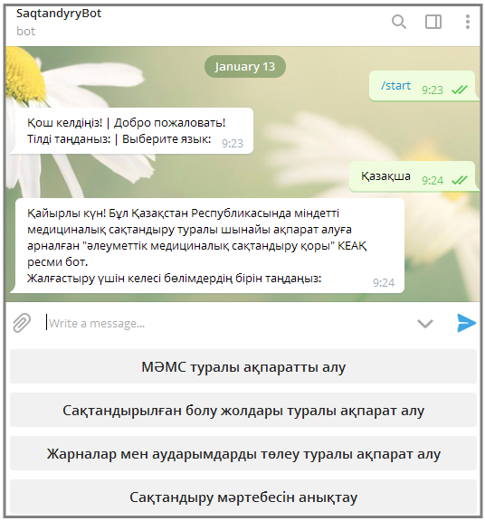 Обращаться с ботом легко – достаточно ввести ИИН. Бот использует информационную систему «Saqtandyry», которая содержит информацию про ОСМС: как застраховаться, получить информацию об оплате взносов и отчислений.