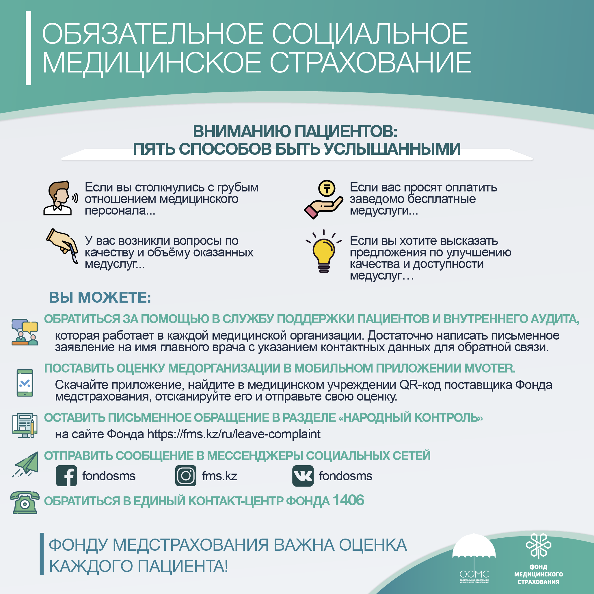 Мы стремимся улучшить качество обслуживания казахстанцев в системе обязательного медстрахования, поэтому нам необходима обратная связь с пациентами. Пожалуйста, не стесняйтесь отправлять замечания или отзывы по оказанным услугам, либо жалобы на низкое качество, плохое обращение медперсонала.